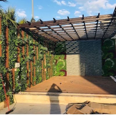 يتم عمل تركيب مظله جلسه خشبية من القوائم الحديد ومن التيوبات المربعه ويتم طلائها بالدهان الاساس ثم بالدهان الناري اللون البني المحروقي ومن فم يتم تغطية السقف بماده اللكسان ذو كثافه عالية.