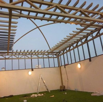 - مظلات جلسات حديد مغطى بمادة اللكسان يبدا سعر المتر المربع من 200 ريال ويصل الى 280 ريال.